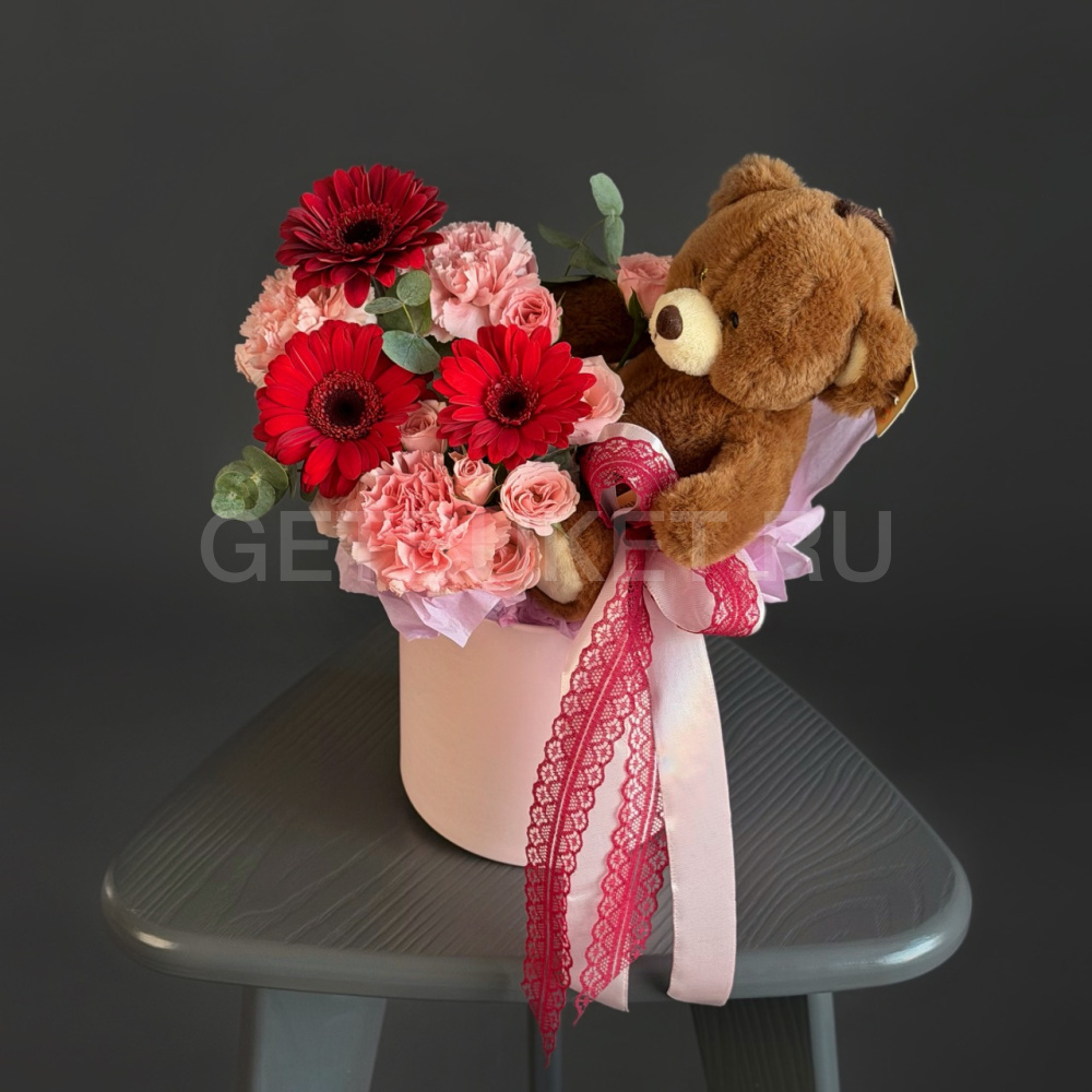 Цветочная композиция из гербер, гвоздик и кустовой розы с мишкой