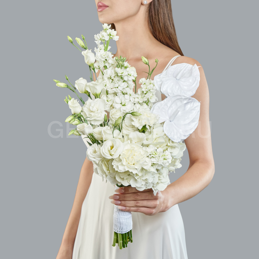 Букет невесты из белой гортензии, эустомы и маттиолы
