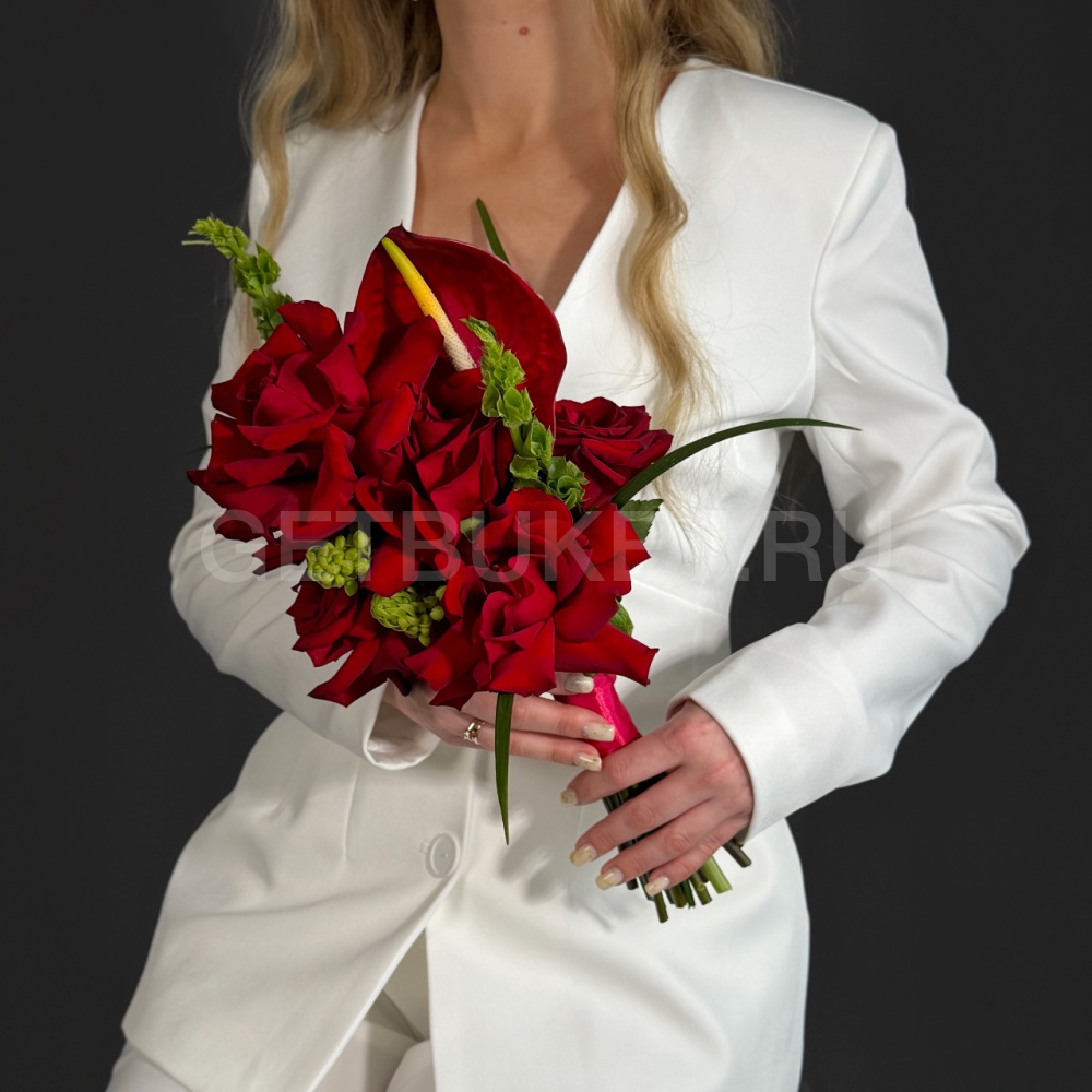 Букет невесты из роз, берграсса и антуриума