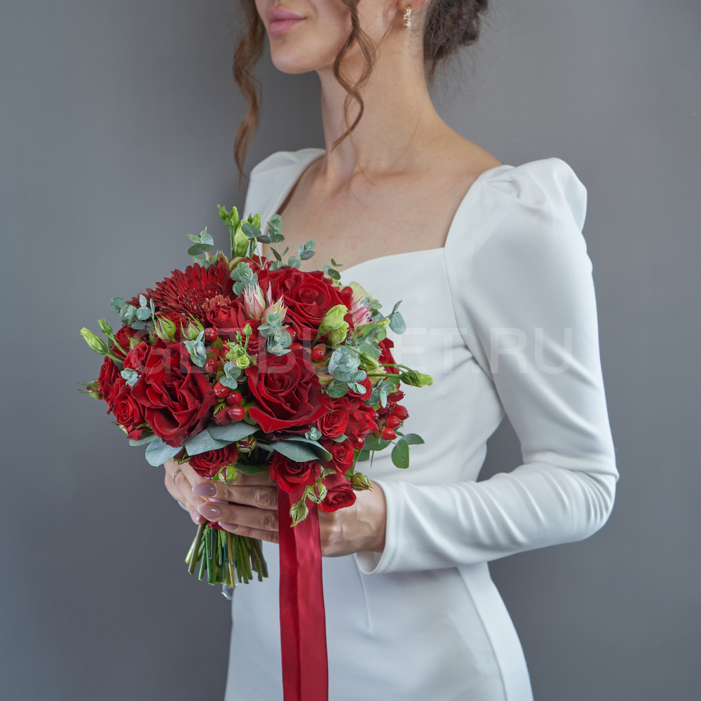 Букет невесты из красных роз и гиперикума