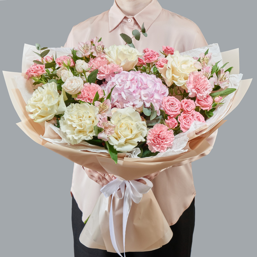 Букет из роз, гвоздик и розовой гортензии с эустомой20 850 ₽Букет из роз, гвоздик и розовой гортензии с эустомой 20 850 ₽ -