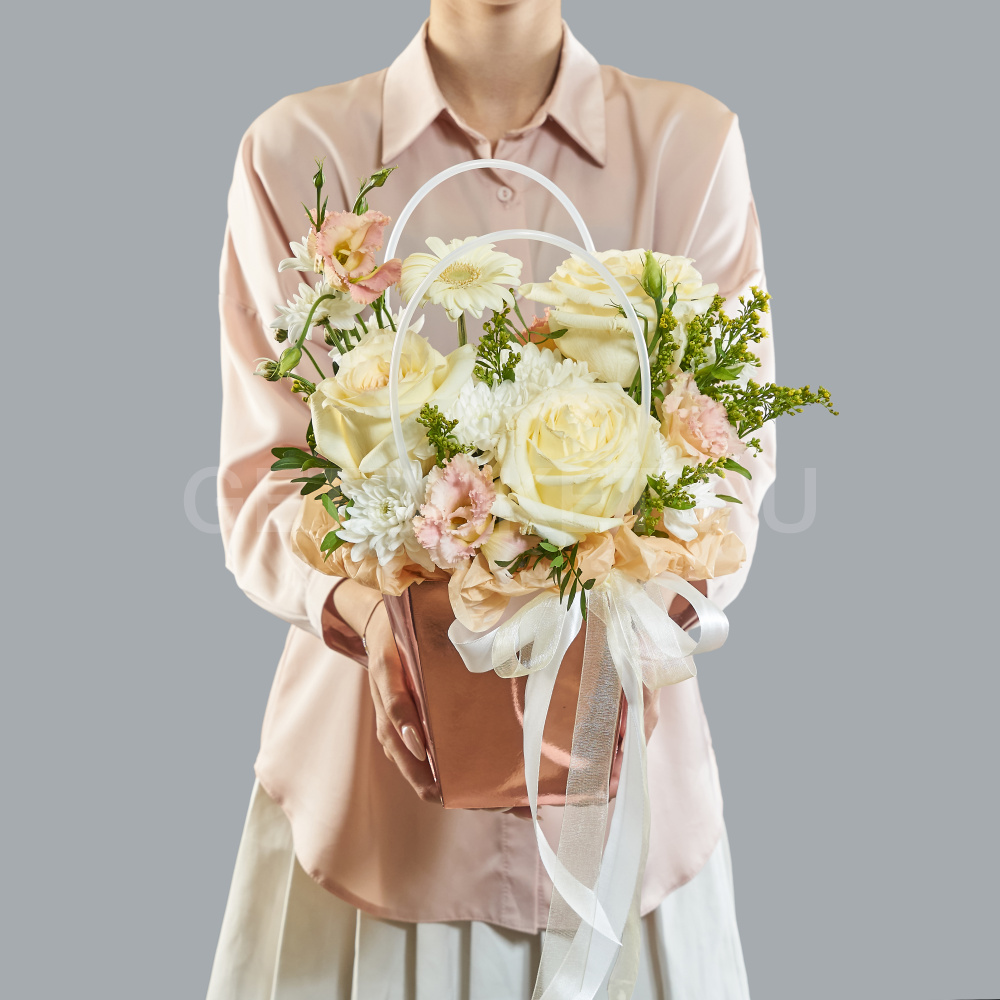 Цветочная композиция с розами, хризантемой и танацетумом в сумочке4 470 ₽Цветочная композиция с розами, хризантемой и танацетумом в сумочке 4 470 ₽ -