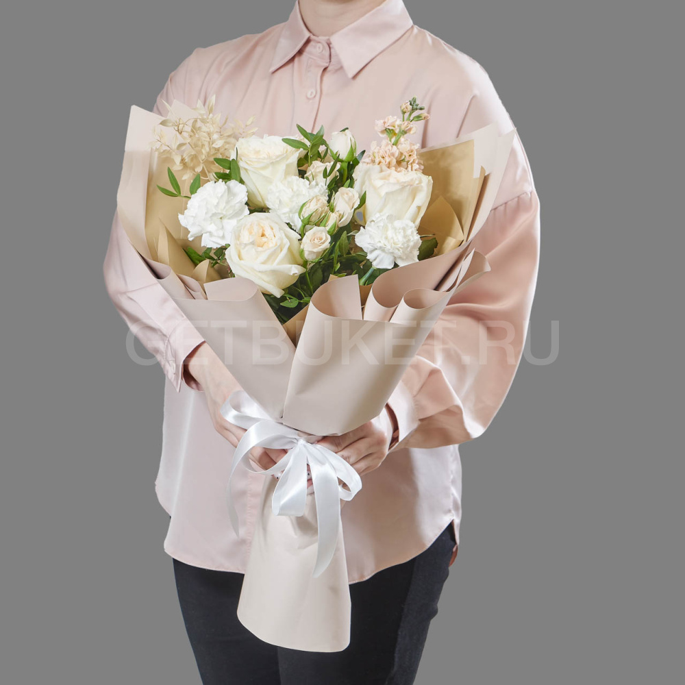 Букет из белых роз, гвоздик и эустомы13 350 ₽Букет из белых роз, гвоздик и эустомы 13 350 ₽ -