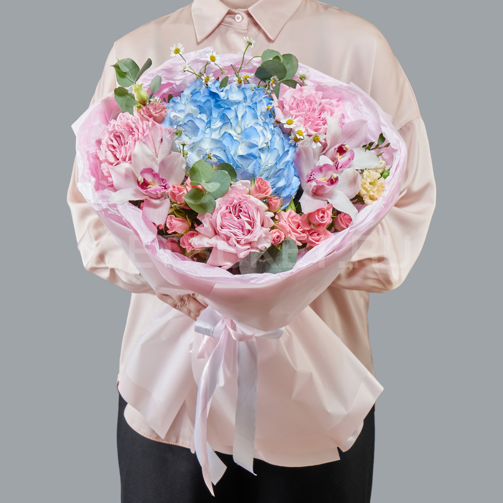 Букет из роз, гвоздик и розовой гортензии с эустомой20 850 ₽Букет из роз, гвоздик и розовой гортензии с эустомой 20 850 ₽ -