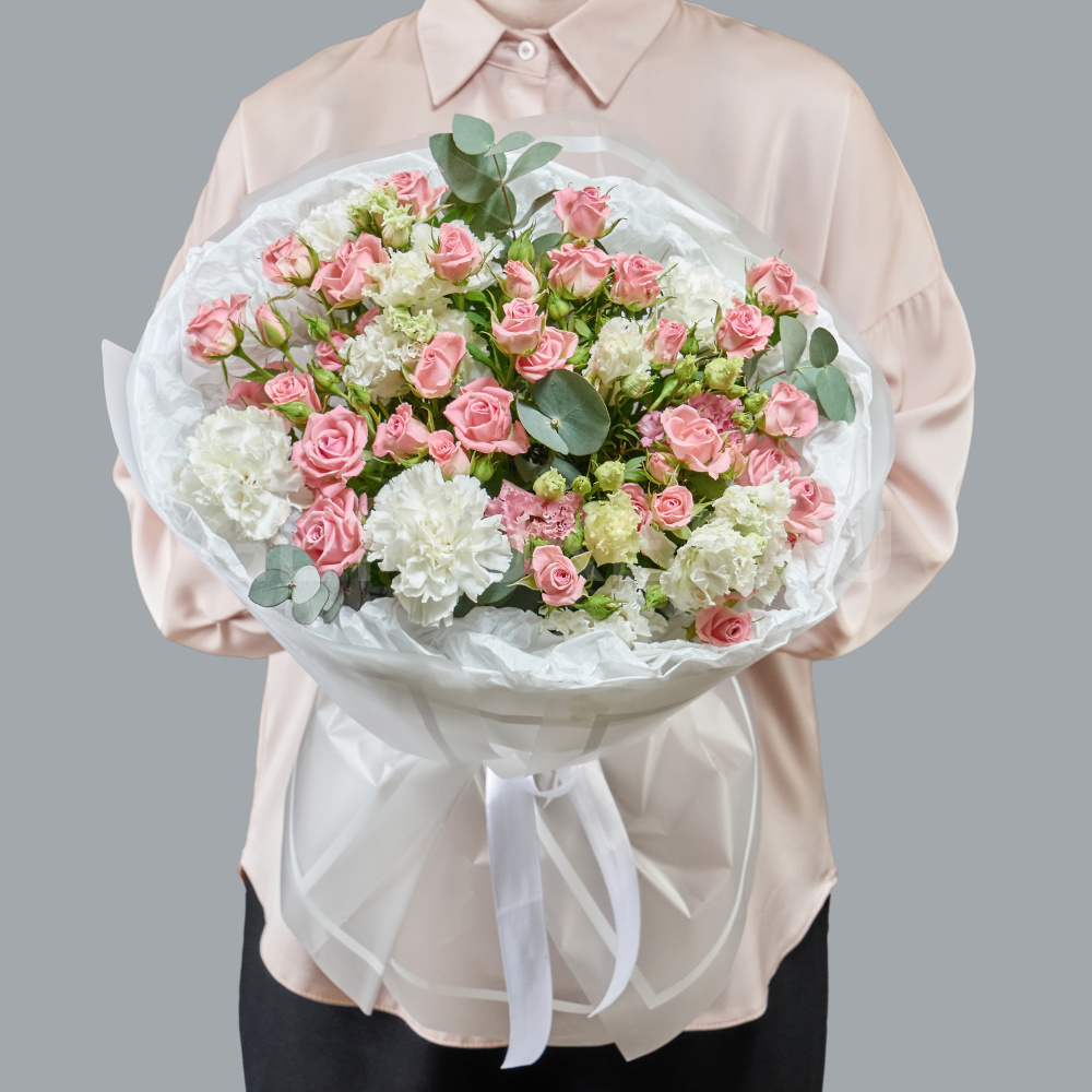 Букет из белых роз, гвоздик и эустомы13 350 ₽Букет из белых роз, гвоздик и эустомы 13 350 ₽ -