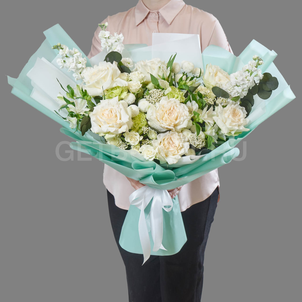 Букет из белых роз, гвоздик и эустомы13 350 ₽Букет из белых роз, гвоздик и эустомы 13 350 ₽ -
