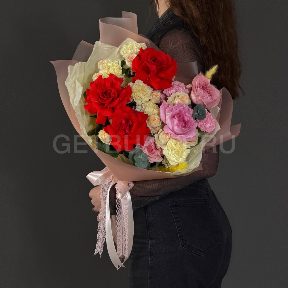 Букет роз с гвоздикой, эвкалиптом и пистакией