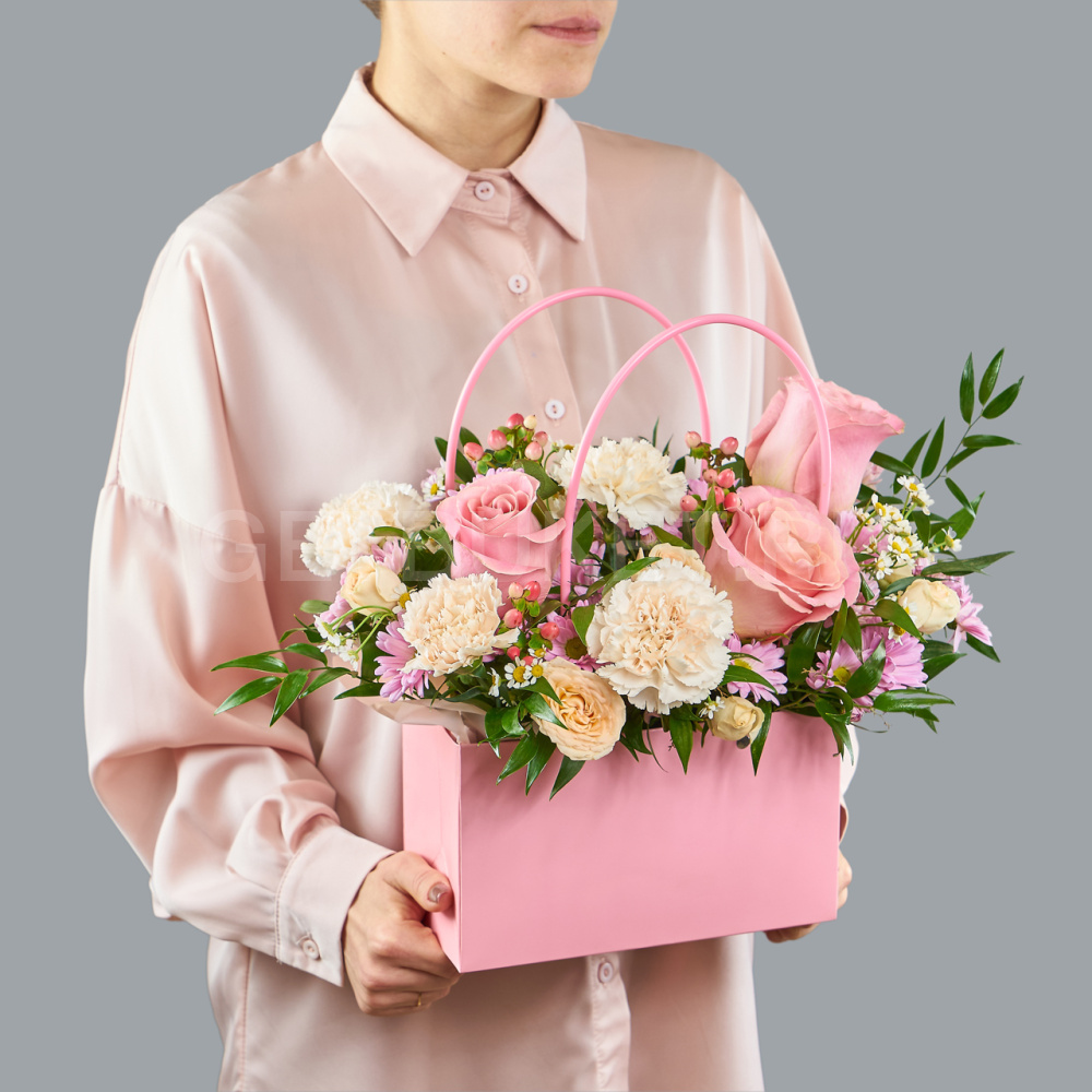 Цветочная сумочка из розовых роз, кремовых гвоздик с гиперикумом