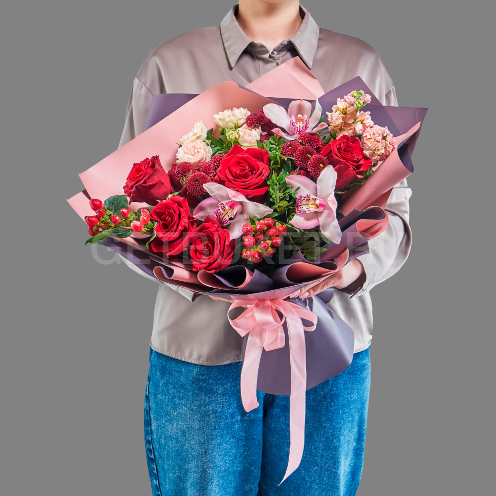Букет из красных роз, маттиолы и орхидеи