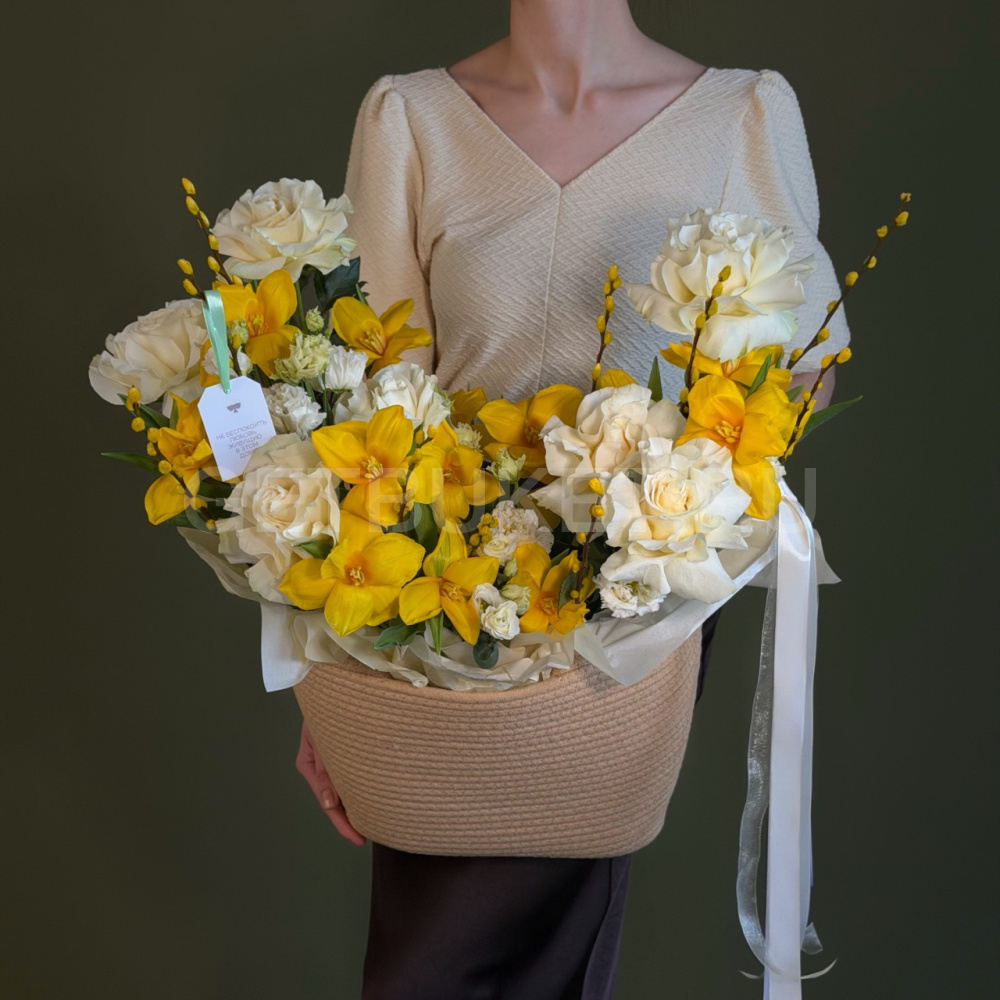 Цветочная композиция с гвоздиками, нарциссами и вербой в плетеной корзине5 850 ₽Цветочная композиция с гвоздиками, нарциссами и вербой в плетеной корзине 5 850 ₽ -