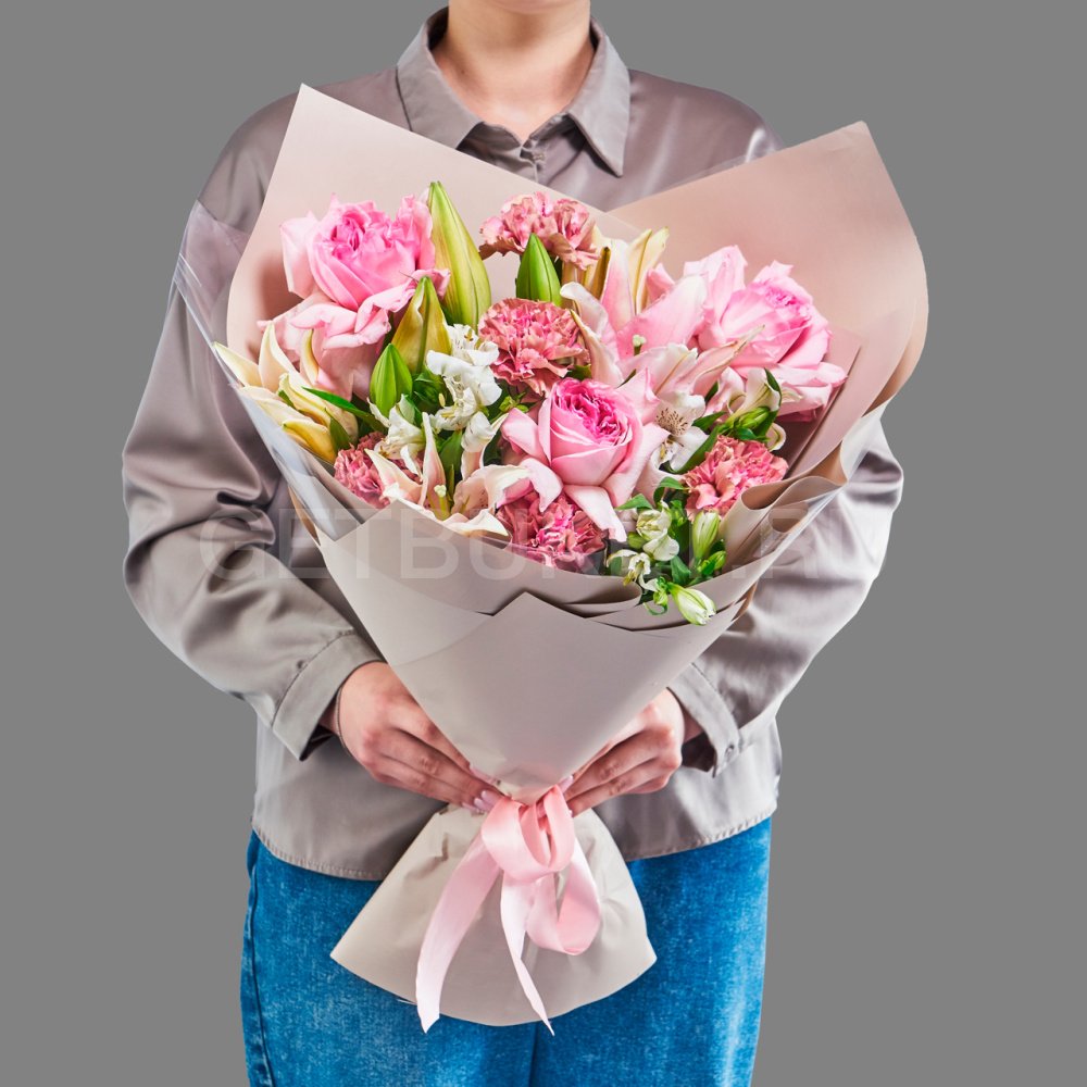 Букет из роз, лилий и альстромерии
