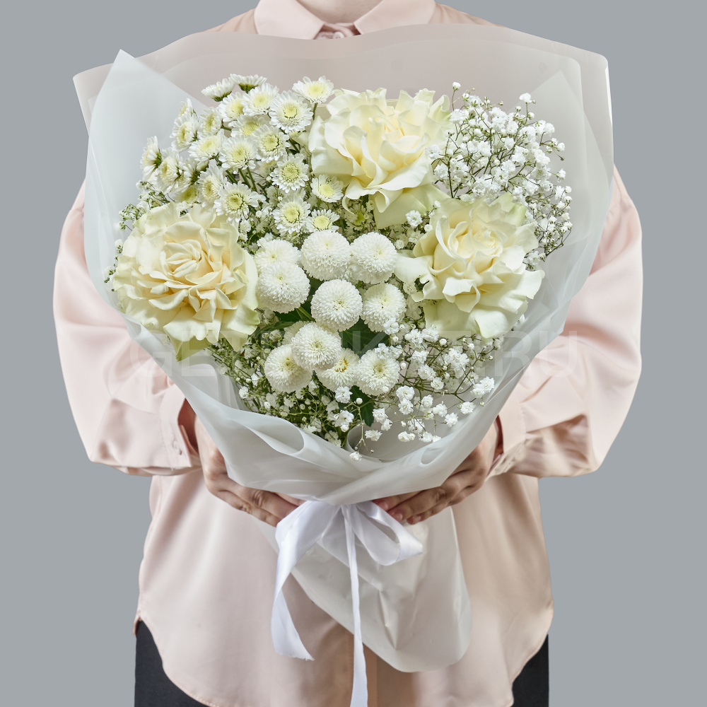 Букет белых роз, хризантем и гипсофилы