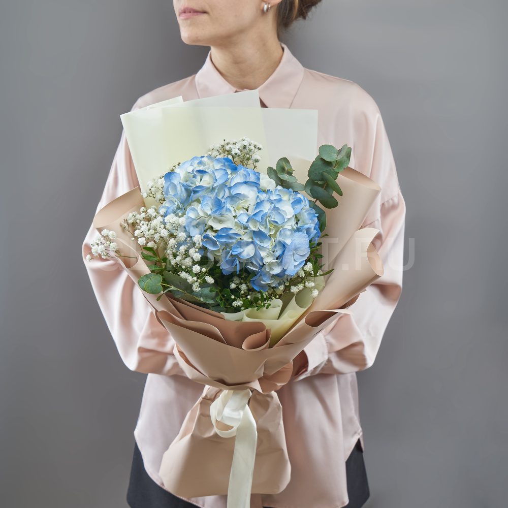 Букет из голубой гортензии с гипсофилой