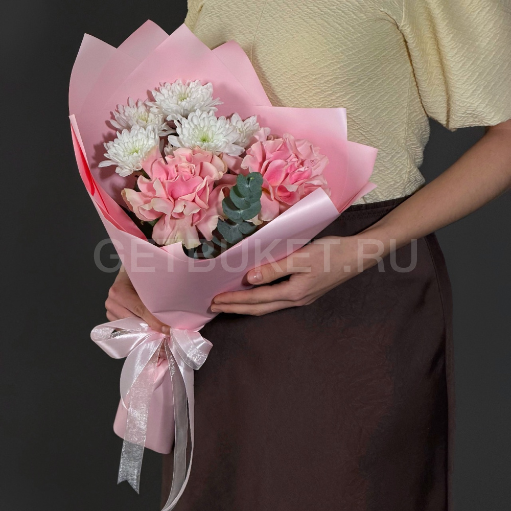 Букет розовых роз с гвоздиками4 650 ₽Букет розовых роз с гвоздиками 4 650 ₽ -